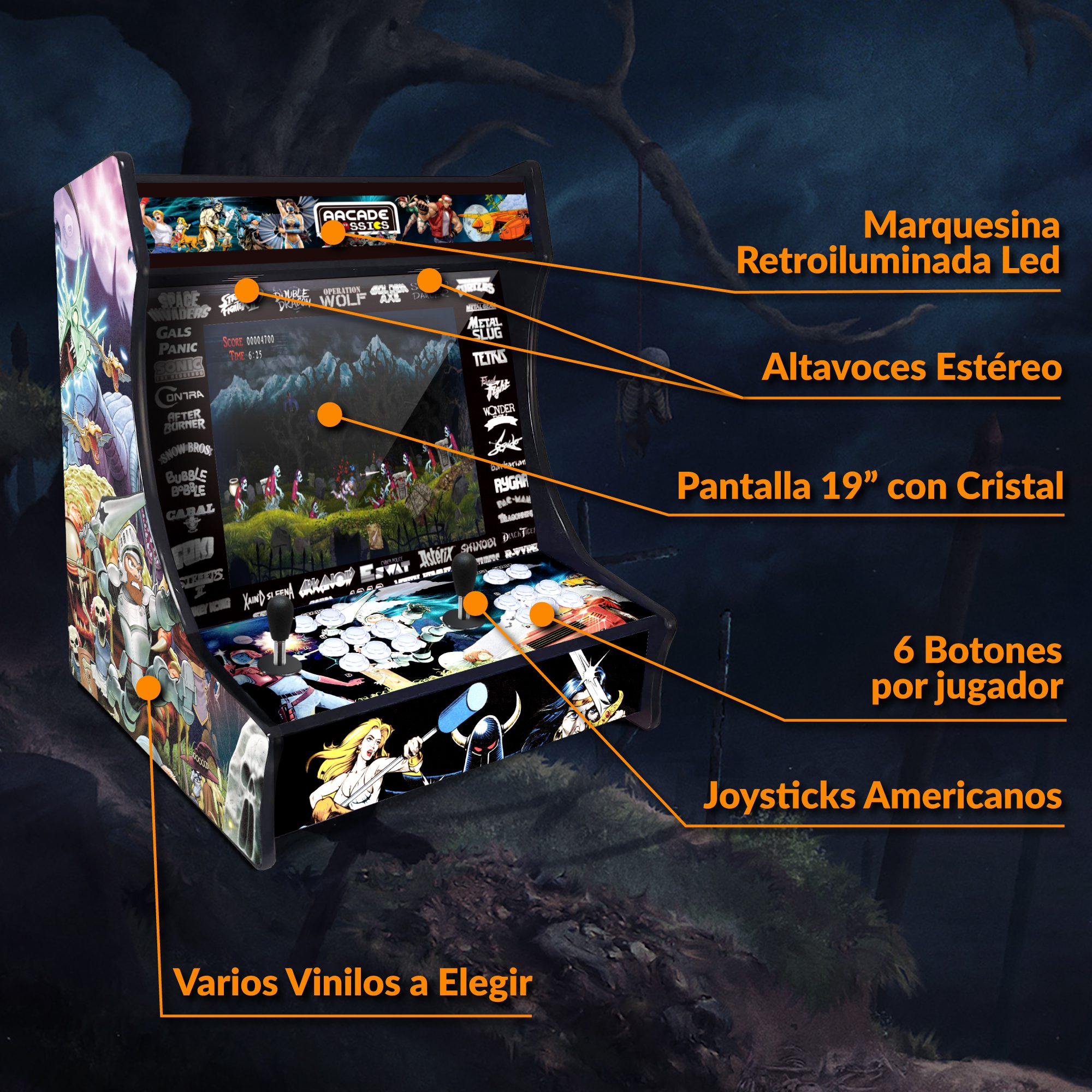 La bartop de 19" ha sido desarrollada a mano tal como se realizaban las originales máquinas recreativas, un auténtico mueble arcade jamas soñado por los entusiastas de los juegos retro ya está aquí configurable en múltiples idiomas, sus características técnicas más destacables son: