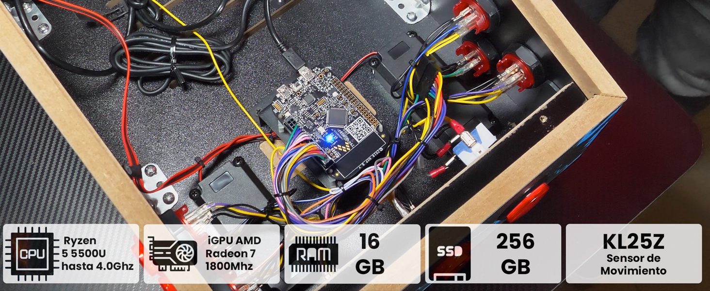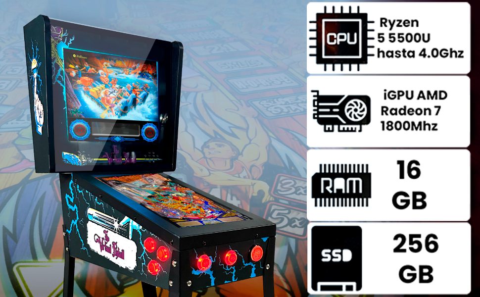 Pinball Virtual, Playfield 18.5″, Backglass 15″, PC RYZEN 5 5500 iGPU AMD Radeon 7 1800Mhz 16GB RAM 256GB SSD, Incluye más de 500 Tablas de Visual Pinball y más de 900 Juegos de mame Vertical, Sensor KL25Z, Incluye Gamepad